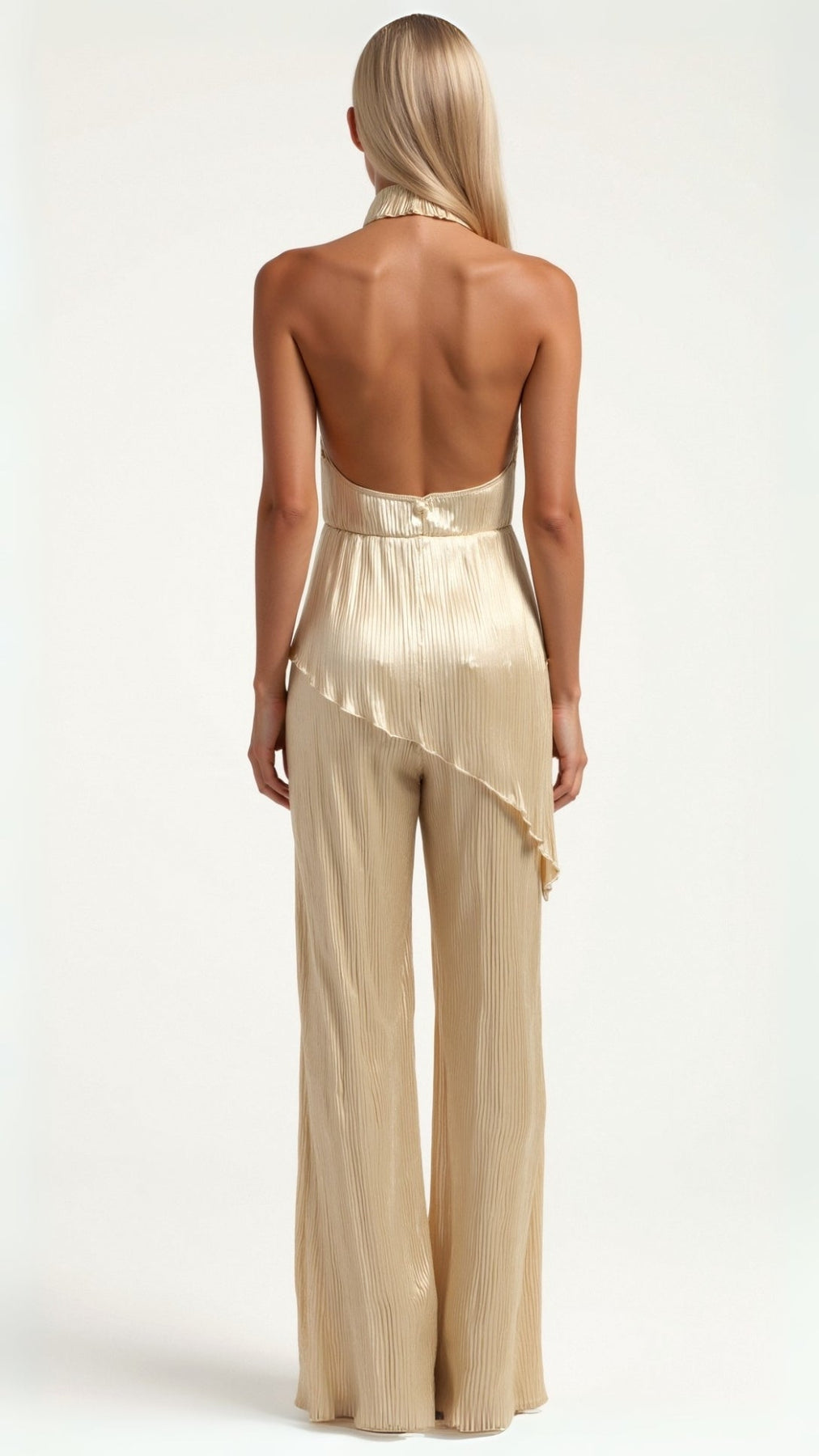 Turn heads in this luxurious golden Co-ord set, designed with a sleek high neckline and a dramatic open back for a stunning evening look. The soft satin fabric drapes beautifully, highlighting every movement with a subtle shimmer. Its wide-leg silhouette creates a flattering, elongated shape, while the asymmetrical hem adds a modern touch. Perfect for parties, events, and nights out where you want effortless elegance with statement appeal.